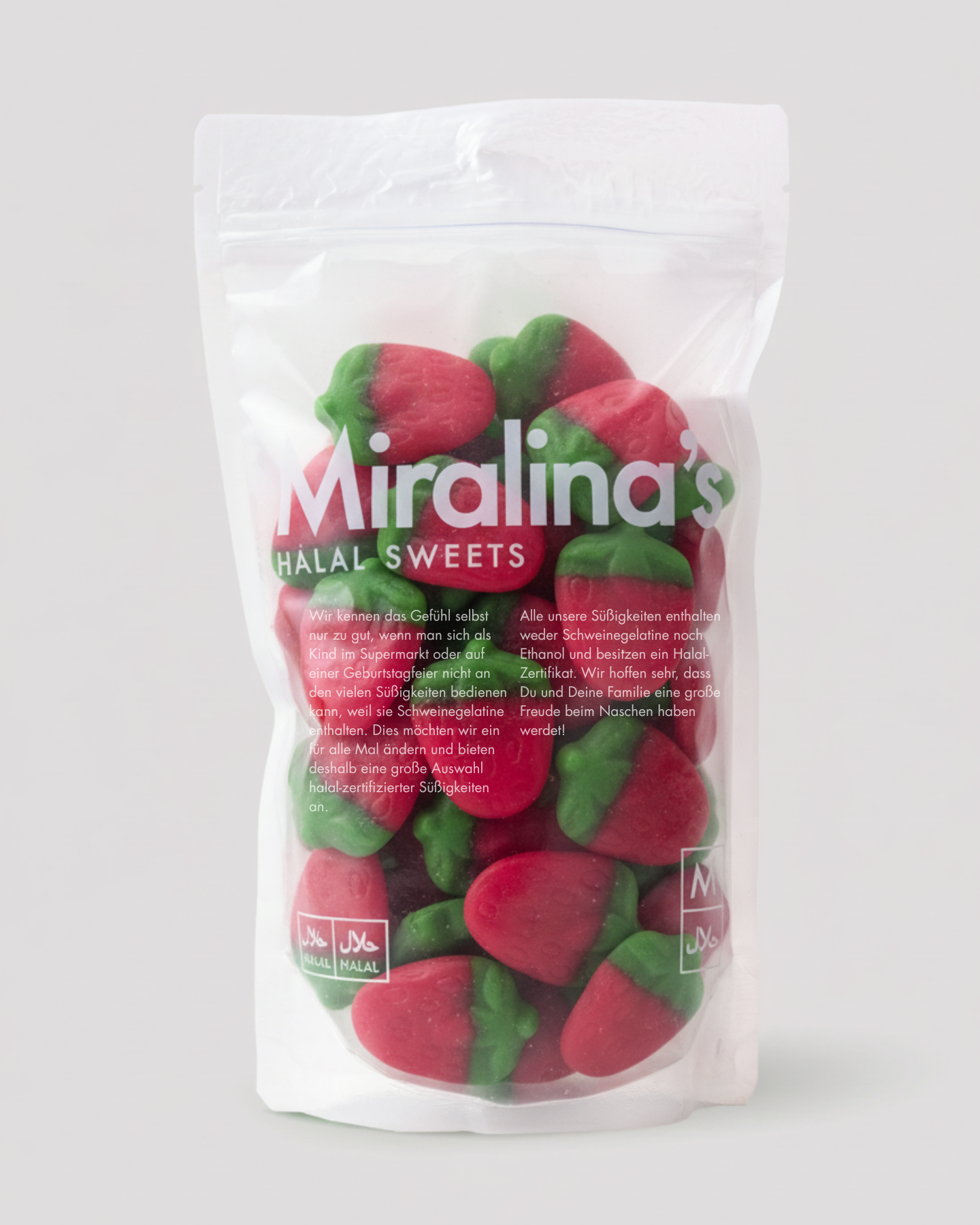 Miralina's with delicious strawberry flavor. The bag contains 500g of halal sweets.