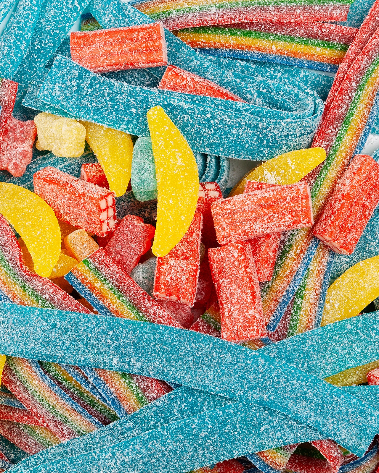 » Ingredientes: jarabe de azúcar invertido, jarabe de glucosa, jarabe de glucosa-fructosa, agua, HARINA DE TRIGO, almidón de patata modificado, dextrosa, gelatina de vacuno, grasa vegetal (coco), 5 % de zumo de fruta a partir de concentrado (manzana, uva, pera; piña; melocotón), acidulantes: E330, E296, E270; regulador de la acidez: E350; emulgente: E471 (vegetal); aromas, conservante: E202; colorantes: E102, E129, E133, E341, E516; vitamina C: ácido L-ascórbico (0,2 %)